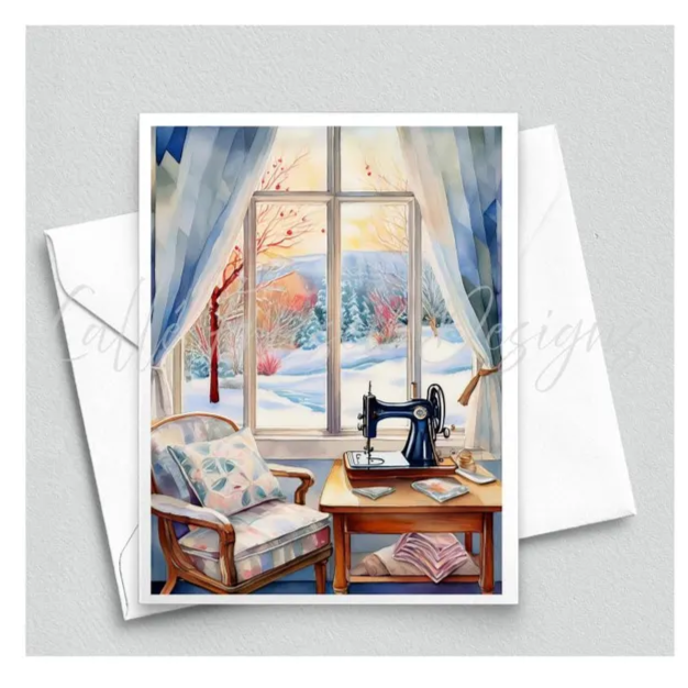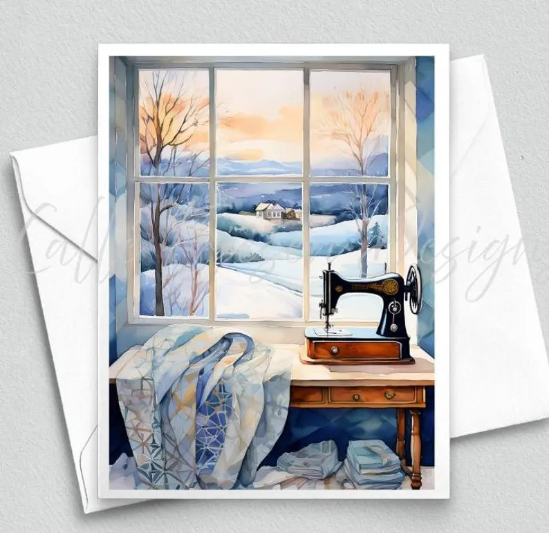 Sewing Room Snow Day, Hot Tea, Winter Holiday Greeting Card, Vintage Sewing Machine, Antique Quilting, Watercolor Painting, Christmas Gift