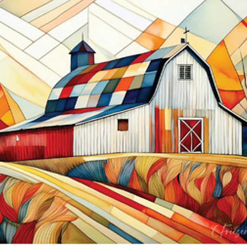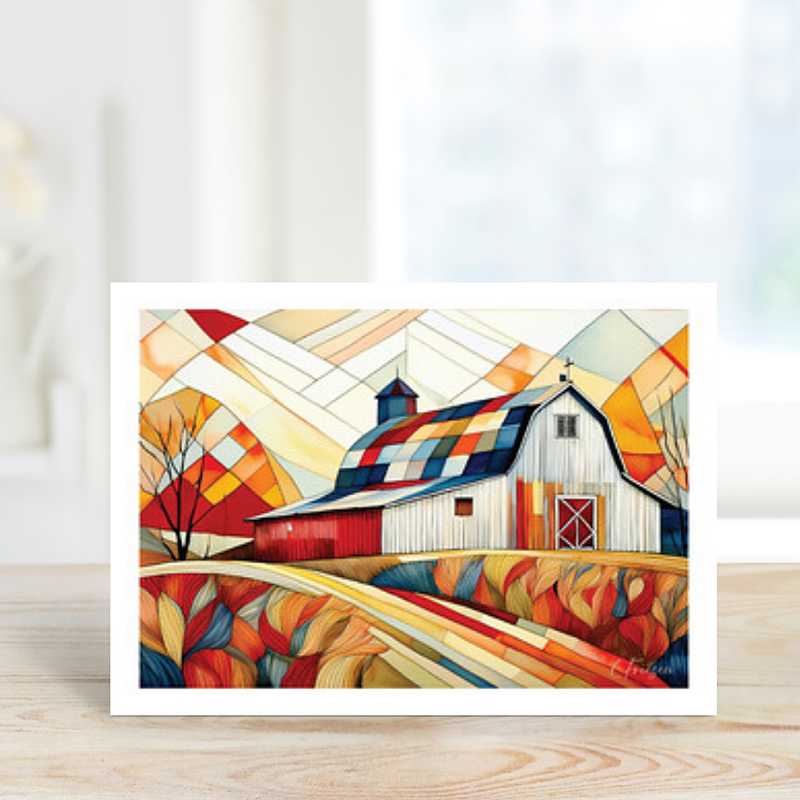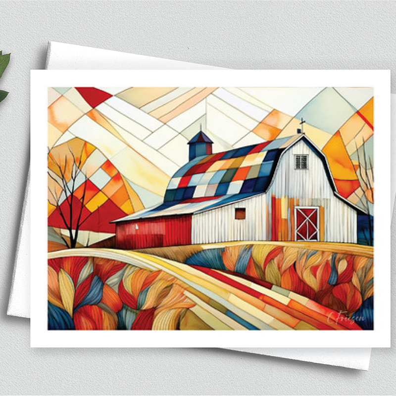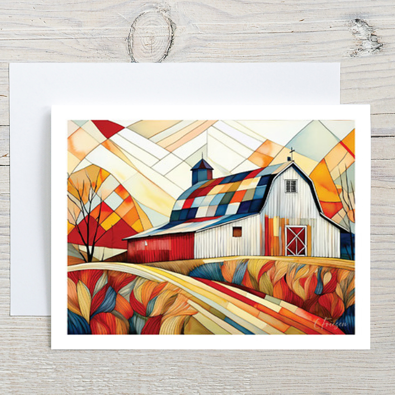 "Peace & Pride" signature quiltscape art notecard. Rectangular A2 sized (4.25 x 5.5 inch) printed on quality 100 lb stock with matching white envelope. Blank inside. This design is part of Quiltberry Farm's Quilted Barns Collection. Designs in this series make perfect greetings for your favorite quilter, sewist, or farm and country enthusiast.  Ideal for sending autumn greetings, fall-themed thinking of you, thank yous, birthday wishes, or creative messages celebrarting all occasions.