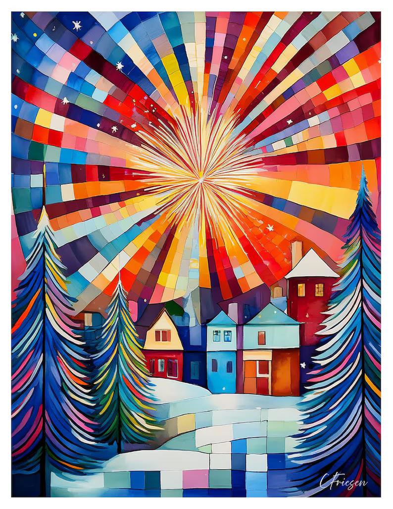 “Midnight Moment” captures the joyful fireworks celebration over a winter village. This vibrantly colorful art card measures 4.25 x 5.5 inches (A2) and comes with a matching red envelope. Each card is individually packaged in a clear protective sleeve. “Midnight Moment” is part of Quiltberry Farm’s Happy New Year Collection.