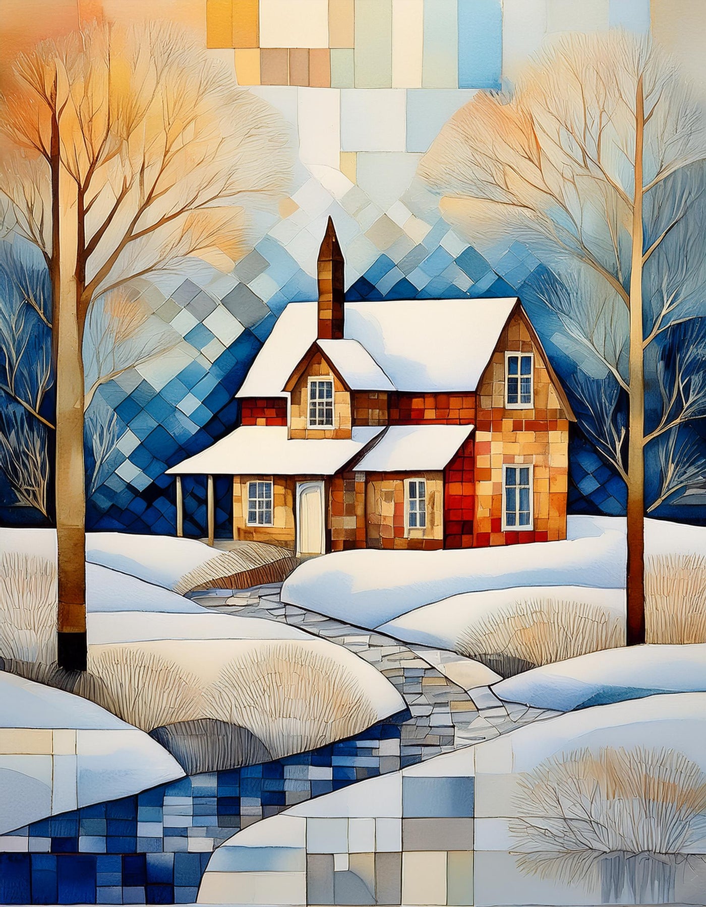 "Homestead" signature quiltscape art notecard. Rectangular A2-sized (4.25 x 5.5 inch) printed on quality 100 lb stock with a matching white envelope. Blank inside. This design is part of Quiltberry Farm's Winterscape Collection. Designs in this series make perfect greetings for your favorite quilter or sewist. Ideal for sending thinking of you, holiday greetings, winter thank yous, birthday wishes, or creative messages celebrating any occasion.