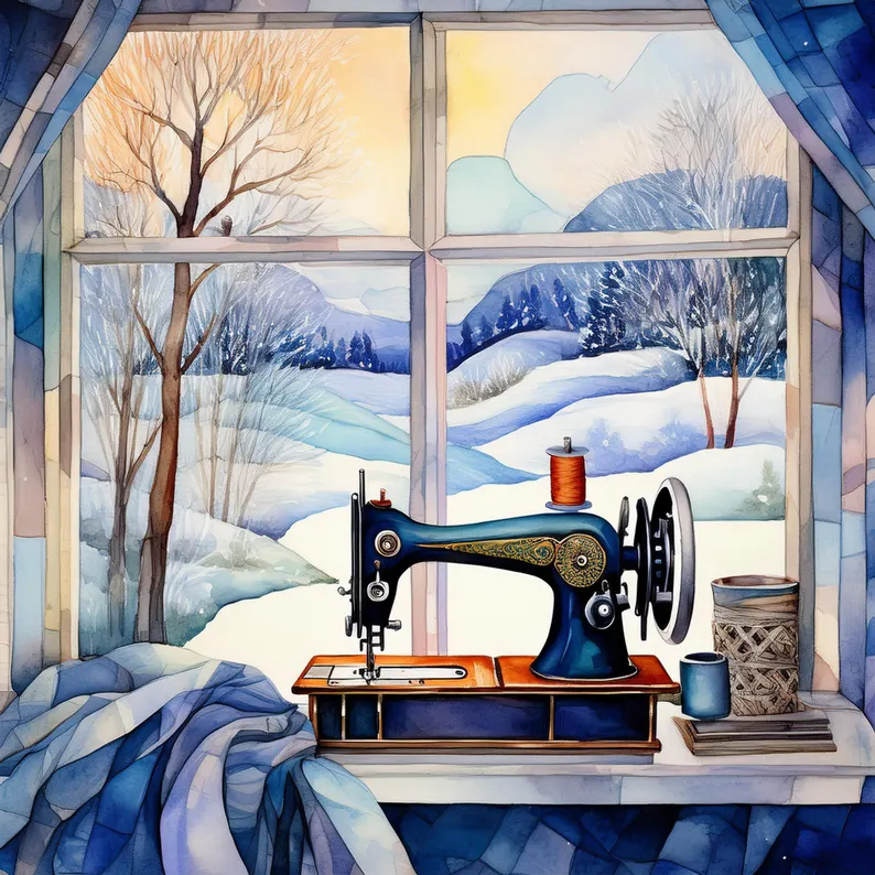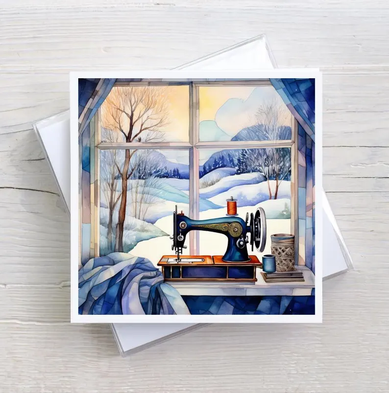 Sewing Room Snow Day, Hot Tea, Winter Holiday Greeting Card, Vintage Sewing Machine, Antique Quilting, Watercolor Painting, Christmas Gift
