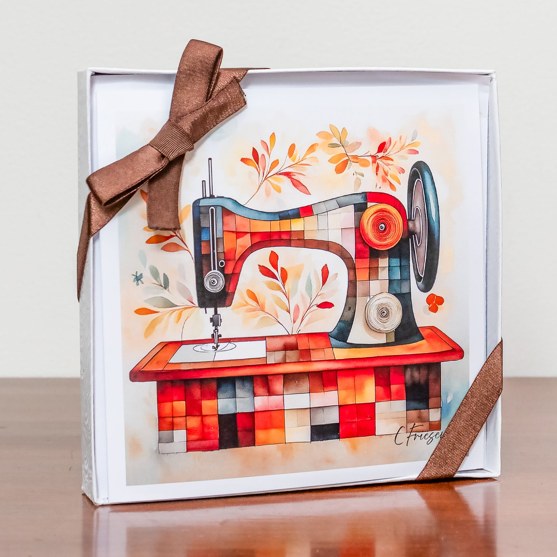The "Antique Autumn Boxed Collection" includes 6 quiltscape art notecards (3 designs) featuring antique sewing machines in harvest colors.  Printed on quality 100 lbs stock, blank inside. This elegant collection is beautifully packaged in a white box with a clear lid and color matched ribbon. Designs in this series make perfect greetings for your favorite quilter or sewist. Ideal for sending thinking of you, thank yous, birthday wishes, or creative messages celebrarting any occasion.